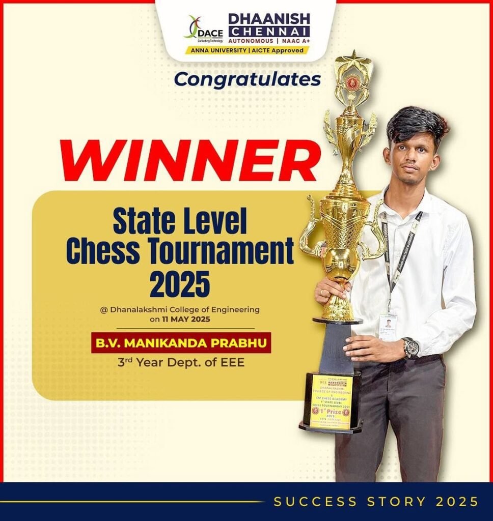 Dhaanish Chennai proudly celebrates a grand victory at the State Level Chess Tournament 2025, held at Dhanalakshmi College of Engineering on 11th May 2025.